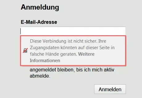 Hier warnt der Browser vor Passworteingaben die nicht verschlüsselt übertragen werden. Bei einer SSL geschützten Website tritt diese Warnung nicht mehr auf.