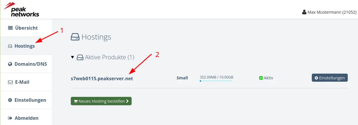 Bevor Sie sich jedoch mit Ihrem peaknetworks Hosting verbinden können, müssen Sie noch Ihren öffentlichen SSH Schlüssel im peaknetworks Controlpanel hinzufügen. Dazu melden Sie sich einfach mit Ihren Zugangsdaten an, klicken dann im linken Reiter auf "Hostings" [1], wählen Ihr Hosting aus[2] und gehen auf den Reiter "SSH" [3].