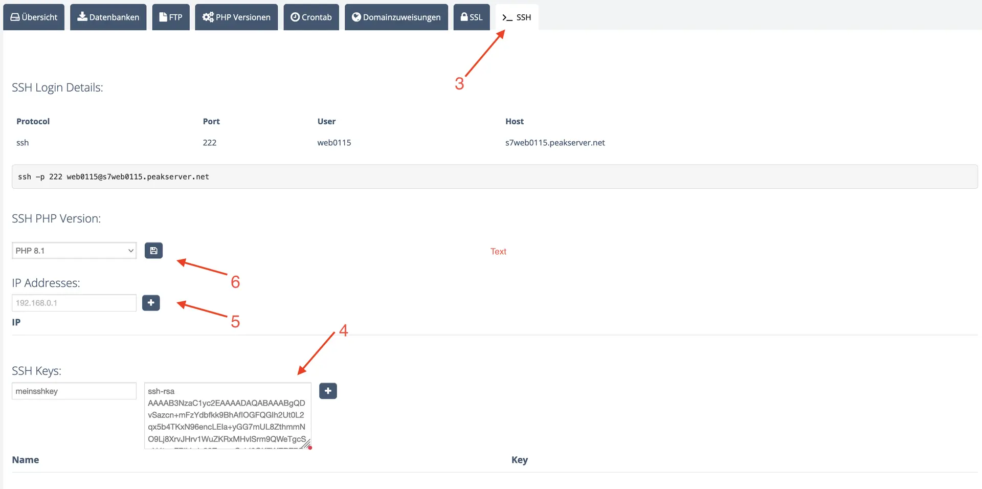Hinzufügen des SSH-Keys zum peaknetworks Hosting